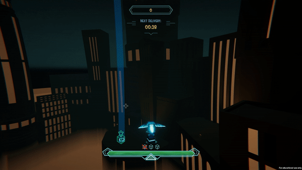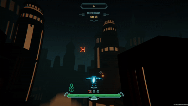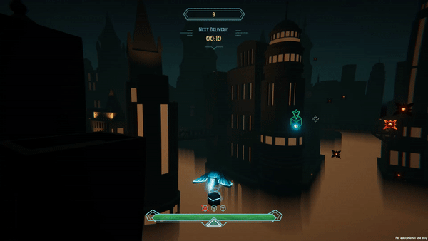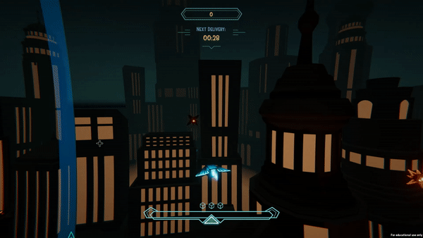 To achieve this, there are two different modes for the player drone. One is flight mode which gives the drone a fighter jet like movement focusing on speed. It is the ideal mode for traversing sizeable areas and avoiding enemy fire. The other mode is hover mode, giving movement more similar to that of a helicopter being slower but more precise. This is necessary picking up and dropping packages as the packages won't attach or detach other wise. This is also ideally in use when traversing tight spaces.